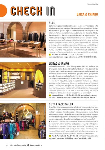 Os homens gostam cada vez mais de andar bem vestidos e esta loja é uma morada a anotar. Há roupa e ténis em edições limitadas e marcas que até aqui só se encontravam em viagem ou na internet. Nomes como Raf Simons, Comme des Garçons, A.P.C., Saturdays NYC, Barena, Common Projects e a portuguesa La Paz trazem a qualquer homem um look urbano cheio de estilo. 3 Men are more and more careful about what they wear and this shop is one place to take note of, stocking clothes and trainers in limited editions and labels which until now you couldn't find in Portugal. These include Raf Simons, Comme des Garçons, A.P.C., Saturdays NYC, Barena, Common Projects and the Portuguese La Paz - which will give any man a stylishly urban look. 4C Rua Nova da Trindade, 22 E · Tel. 21 347 1104 www.sloulisbon.com · seg a sáb / mon to sat 11h-13h30 & 14h30-20h