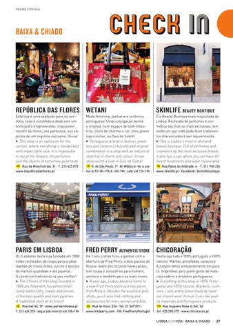 É a Beauty Boutique mais requisitada de Lisboa. Recheada de perfumes e cosmética das marcas mais exclusivas, tem ainda um spa onde pode fazer tratamentos diferenciados e sair rejuvenescido. 3 This is Lisbon’s most in-demand beauty boutique. Full of perfumes and cosmetics by the most exclusive brands, it also has a spa where you can have different treatments and leave rejuvenated. 4E Rua Paiva de Andrade, 4 · T. 211 930 236 www.skinlife.pt · Facebook: Skinlifeboutique