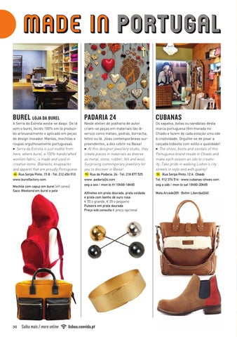 Os sapatos, botas ou sandálias desta marca portuguesa têm morada no Chiado e fazem de cada estação uma ode à criatividade. Orgulhe-se de pisar a calçada lisboeta com estilo e qualidade! 3 The shoes, boots and sandals of this Portuguese brand reside in Chiado and make each season an ode to creativity. Take pride in walking Lisbon’s city streets in style and with quality! 5E Rua Serpa Pinto, 12 A · Chiado Tel. 912 374 516 · www.cubanas-shoes.com seg a sáb / mon to sat 10h00-20h00