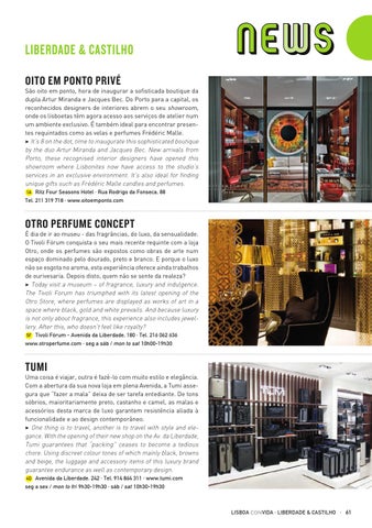 É dia de ir ao museu - das fragrâncias, do luxo, da sensualidade. O Tivoli Fórum conquista o seu mais recente requinte com a loja Otro, onde os perfumes são expostos como obras de arte num espaço dominado pelo dourado, preto e branco. E porque o luxo não se esgota no aroma, esta experiência oferece ainda trabalhos de ourivesaria. Depois disto, quem não se sente da realeza? 3 Today visit a museum – of fragrance, luxury and indulgence. The Tivoli Forum has triumphed with its latest opening of the Otro Store, where perfumes are displayed as works of art in a space where black, gold and white prevails. And because luxury is not only about fragrance, this experience also includes jewellery. After this, who doesn’t feel like royalty? 5F Tivoli Fórum - Avenida da Liberdade, 180 · Tel. 216 062 636 www.otroperfume.com · seg a sáb / mon to sat 10h00-19h30
