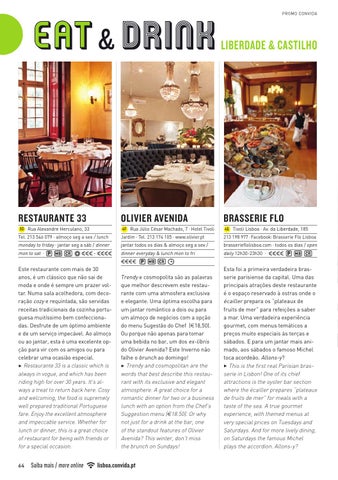 Esta foi a primeira verdadeira brasserie parisiense da capital. Uma das principais atrações deste restaurante é o espaço reservado à ostras onde o écailler prepara os “plateaux de fruits de mer” para refeições a saber a mar. Uma verdadeira experiência gourmet, com menus temáticos a preços muito especiais às terças e sábados. E para um jantar mais animado, aos sábados o famoso Michel toca acordeão. Allons-y? 3 This is the first real Parisian brasserie in Lisbon! One of its chief attractions is the oyster bar section where the écailler prepares “plateaux de fruits de mer” for meals with a taste of the sea. A true gourmet experience, with themed menus at very special prices on Tuesdays and Saturdays. And for more lively dining, on Saturdays the famous Michel plays the accordion. Allons-y?