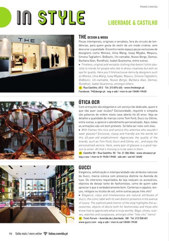 Elegância, sofisticação e intemporalidade são atributos naturais da Gucci, marca icónica com presença distinta na Avenida do luxo. Os interiores requintados da loja realçam os acessórios, objectos de desejo tanto de fashionistas, como de quem sabe apreciar o que é verdadeiramente bom. Carteiras e sapatos, lenços, relógios ou óculos de sol, entre outras peças très chic! 3 Elegance, class and timelessness are natural attributes of Gucci, the iconic label with its own distinct presence in the avenue of luxury. The sophisticated interior of the shop highlights the accessories, objects of desire both for fashionistas and those who know how to appreciate what is truly worthy. Bags, shoes, scarves, watches and sunglasses, amongst other "très chic" items! 5F Tivoli Forum - Avenida da Liberdade, 180 · Tel. 213 528 401 www.gucci.com · seg a sáb / mon to sat 10h00-19h30