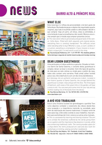 Esta nova loja é o reflexo da personalidade e do bom gosto de Sofia Anjos. Recheada de peças e objetos tão requintados quanto originais, aqui tudo é escolhido a dedo e a dificuldade é decidir o que comprar. Seja um jarro, um lenço, velas ou almofadas, é uma tentação à qual aconselhamos não resistir. Merece uma visita sempre que a missão seja comprar presentes únicos. 3 This new store reflects personality and good taste of the owner, Sofia Anjos. Filled with both exquisite and original pieces, everything here is carefully handpicked. The difficulty arises when deciding what to buy! Whether a vase, a scarf, candles or a cushion, everything is a temptation. If your mission is to purchase a unique gift, it is well worth a visit to this shop. 4A Rua da Escola Politécnica, 219 · T. 211 979 757 · FB: whatelse.giftstore fecha domingo e segunda de manhã/ closed sunday and monday morning