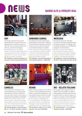 Um fato que cai bem é outra coisa! Nesta loja, fatos e camisas feitos à medida garantem o conforto de quem as veste. Do corte ao tecido, dos bolsos às costuras, a escolha é do freguês. 3 A well tailored suit is a thing of beauty! The suits and shirts made at this shop guarantee the comfort of whoever wears them. From the cut to the fabric, pockets and seams, you decide. 7D Embaixada - Praça do Príncipe Real, 26 www.uoy.me · todos os dias/open daily 10h-20h
