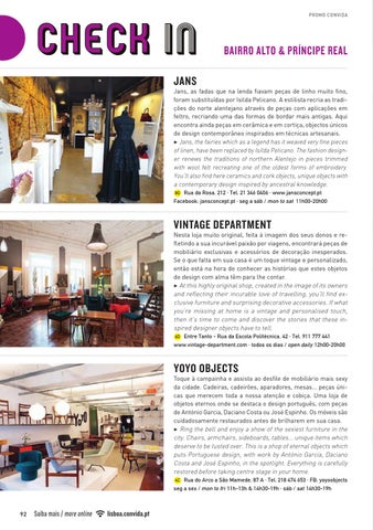 Jans, as fadas que na lenda fiavam peças de linho muito fino, foram substituídas por Isilda Pelicano. A estilista recria as tradições do norte alentejano através de peças com aplicações em feltro, recriando uma das formas de bordar mais antigas. Aqui encontra ainda peças em cerâmica e em cortiça, objectos únicos de design contemporâneo inspirados em técnicas artesanais. 3 Jans, the fairies which as a legend has it weaved very fine pieces of linen, have been replaced by Isilda Pelicano. The fashion designer renews the traditions of northern Alentejo in pieces trimmed with wool felt recreating one of the oldest forms of embroidery. You’ll also find here ceramics and cork objects, unique objects with a contemporary design inspired by ancestral knowledge. 8G Rua da Rosa, 212 · Tel. 21 346 0406 · www.jansconcept.pt Facebook: jansconcept.pt · seg a sáb / mon to sat 11h00-20h00