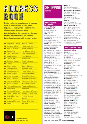 MØBLER 4F Rua Nova da Piedade, 41 São Bento · Tel. 911 005 860 RICARDO HOGAN ANTIGUIDADES 3C Rua de São Bento, 281 São Bento · Tel. 21 395 4102 SÃO ROQUE TOO 3D Rua de São Bento, 269 São Bento · Tel. 21 397 0197 SOLAR 8E Rua Dom Pedro V, 70 Príncipe Real · Tel. 21 346 5522 VINTAGE DEPARTMENT 6C Entre Tanto - Indoor Market Rua da Escola Politécnica, 42 Príncipe Real · Tel. 911 777 441 YOYO OBJECTS 4C Rua Arco a São Mamede, 87 A Príncipe Real · Tel. 21 847 4653 Facebook: Yoyo objects ZARCO ANTIQUES AND ART GALLERY 4D Rua Marcos Portugal, 34 Príncipe Real · Tel. 914 012 633 www.zarcoantiques.com