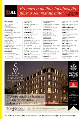 LOUIS VUITTON 6F Avenida da Liberdade, 190 A Tel. 21 358 4320 LUIS ONOFRE 5C Avenida da Liberdade, 247 Tel. 211 313 629 LUVARIA ULISSES 6D Rua do Carmo, 87 A - Chiado Tel. 21 342 0295 MA&CE 4E Rua Paiva de Andrade, 1 - Chiado Tel. 213 475 190 Facebook: MACE MAISON NUNO GAMA 7E Rua do Século, 171 Príncipe Real · Tel. 21 347 9068 MARINA RINALDI 5C Avenida da Liberdade, 258 B Tel. 21 315 0206 MASSIMO DUTTI www.massimodutti.pt • Av. da Liberdade, 110 A 6G Tel. 21 346 0149 • Rua Garrett, 15 - Chiado 6E