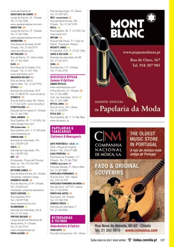 www.samsonite.pt SAPATARIA DO CARMO 5D Largo do Carmo, 26 · Chiado Tel. 21 342 3386 www.sapatariadocarmo.com SHOES YOU 5D Largo do Carmo, 27 · Chiado Tel. 21 342 3386 www.sapatariadocarmo.com SKUNKFUNK 6F Rua Nova do Almada, 82-84 Chiado · Tel. 21 346 0119 www.skunkfunk.com SKY WALKER 9J Rua do Norte, 12 - Bairro Alto Tel. 21 346 1048 SLOU 4C Rua Nova da Trindade, 22 E Chiado · Tel. 21 347 1104 www.sloulisbon.com SNEAKERS DELIGHT 9J Rua do Norte, 30-32 Bairro Alto · Tel. 21 347 9976 STIVALI 6H Avenida da Liberdade, 38 B Tel. 21 380 5110 · www.stivali.pt STONEFLY 7D Rua de Santa Justa, 55 - Baixa T. 21 342 6328 · www.stonefly.it STORYTAILORS 4H Calçada do Ferragial, 8 - Chiado Tel. 21 343 2306 TARA JARMON 4B Rua Castilho, 90 · T. 213 874 134 www.tarajarmon.com THE DESIGN & MODA 4B Rua Castilho, 65 C · T. 21 387 4434 www.thedesign.pt TIMBERLAND 5E Avenida da Liberdade, 196 Tel. 210 079 239 TOD’S 5E Avenida da Liberdade, 196 Tel. 210 079 253 UOY 7D Embaixada · Praça do Príncipe Real, 26 · Tel. 916 764 590 www.uoy.me UP!TOWN LISBOA 4C Rua da Misericórdia, 68 - Chiado Facebook: Uptown Lisboa VENÂNCIO TAILOR 3G Rua do Alecrim, 26 M · Chiado Tel. 216 023 631 Facebook: venancio.alfaiataria VESTE COUTURE 4C Rua Castilho, 59 C Tel. 210 997 930 www.vestecouture.com VILEBREQUIN 5E Avenida da Liberdade, 224 A Tel. 21 314 2646 VINTAGE BAZAAR 5F Largo Academia Nacional de Belas Artes, 5 - Chiado Tel. 21 346 7123 www.vintagebazaar.pt VIÚVA ALEGRE 8E