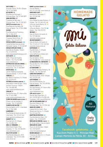 DAS FLORES 3F Rua das Flores, 76-78 - Chiado Tel. 21 342 8828 DE CASTRO 5E Rua Marcos Portugal, 1 Príncipe Real · Tel. 21 590 3077 DONA QUITÉRIA 5F Travessa de São José, 1 Príncipe Real · Tel. 21 395 1521 DUPLEX RESTAURANTE & BAR 2G Rua Nova do Carvalho, 58 Cais do Sodré · Tel. 91 516 2808 ELEVEN Rua Marquês de Fronteira Tel. 21 386 2211 ENOTECA DE BELÉM 8G Travessa Marta Pinto, 10 Belém · Tel. 213 631 511 ESPAÇO AÇORES RESTAURANTE 12D Largo da Boa Hora (junto ao Mercado) - Ajuda · T. 213 640 881 ESPAÇO ESPELHO D’ÁGUA 6i Avenida de Brasília - Belém Tel. 213 010 510 www.espacoespelhodeagua.com ESTE OESTE 6H CCB - Praça do Império Belém · Tel. 914 914 505 www.esteoeste.pt ESTÓRIAS NA CASA DA COMIDA 2C Travessa das Amoreiras, 1 Amoreiras · Tel. 21 386 0889 ESTUFA REAL 9B Jardim Botânico da Ajuda Calçada Galvão T. 213 619 400 FÁBULAS 6F Cç. Nova S. Francisco, 14 · Chiado Tel. 216 018 472 FEITORIA RESTAURANTE & WINE BAR 5i Altis Belém Hotel & Spa - Doca do Bom Sucesso - Belém Tel. 210 400 200 www.restaurantefeitoria.com FIDALGO 9I Rua da Barroca, 27 - Bairro Alto Tel. 21 342 2900 www.restaurantefidalgo.com FLORES DO BAIRRO BAIRRO ALTO HOTEL 3E Praça Luís de Camões, 8 Chiado · Tel. 21 340 8252 FLORESTA DO SALITRE 5G Rua do Salitre, 42 D - Liberdade Tel. 21 354 7605 GAMBRINUS 6J Rua Portas de Santo Antão, 23 Liberdade · Tel. 213 421 466 www.gambrinuslisboa.com GARRETT 47 5E Rua Garrett, 47 - Chiado Tel. 214 056 338 GRILL D. FERNANDO 4E Altis Grand Hotel - Rua Castilho, 11 · Tel. 213 106 018 www.altishotels.com GUILTY BY OLIVIER 5E Rua Barata Salgueiro, 28 A Liberdade · Tel. 211 913 590 www.olivier.pt