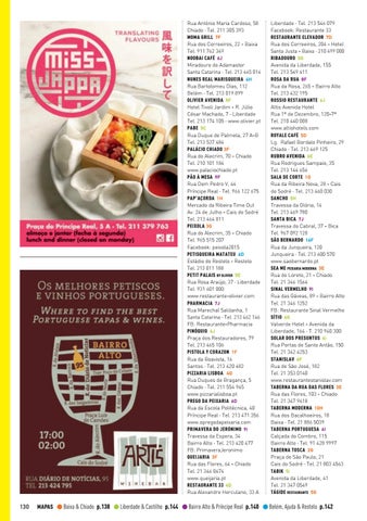 Liberdade · Tel. 213 546 079 Facebook: Restaurante 33 RESTAURANTE ELEVADOR 7D Rua dos Correeiros, 204 - Hotel Santa Justa - Baixa · 210 499 000 RIBADOURO 5G Avenida da Liberdade, 155 Tel. 213 549 411 ROSA DA RUA 8F Rua da Rosa, 265 - Bairro Alto Tel. 213 432 195 ROSSIO RESTAURANTE 6J Altis Avenida Hotel Rua 1º de Dezembro, 120-7º Tel. 210 440 008 www.altishotels.com ROYALE CAFÉ 5D Lg. Rafael Bordalo Pinheiro, 29 Chiado · Tel. 213 469 125 RUBRO AVENIDA 6E Rua Rodrigues Sampaio, 35 Tel. 213 144 656 SALA DE CORTE 1G Rua da Ribeira Nova, 28 - Cais do Sodré · Tel. 213 460 030 SANCHO 5H Travessa da Glória, 14 Tel. 213 469 780 SANTA BICA 7J Travessa do Cabral, 37 - Bica Tel. 967 092 128 SÃO BERNARDO 14F Rua da Junqueira, 120 Junqueira · Tel. 213 600 570 www.saobernardo.pt SEA ME PEIXARIA MODERNA 3E Rua do Loreto, 21 - Chiado Tel. 21 346 1564 SINAL VERMELHO 9I Rua das Gáveas, 89 - Bairro Alto Tel. 21 346 1252 FB: Restaurante Sinal Vermelho SÍTIO 6G Valverde Hotel - Avenida da Liberdade, 164 · T. 210 940 300 SOLAR DOS PRESUNTOS 6i Rua Portas de Santo Antão, 150 Tel. 21 342 4253 STANISLAV 6F Rua de São José, 182 Tel. 21 353 0140 www.restaurantestanislav.com TABERNA DA RUA DAS FLORES 3E Rua das Flores, 103 - Chiado Tel. 21 347 9418 TABERNA MODERNA 10H Rua dos Bacalhoeiros, 18 Baixa · Tel. 21 886 5039 TABERNA PORTUGUESA 6I Calçada do Combro, 115 Bairro Alto · Tel. 91 428 9997 TABERNA TOSCA 2G Praça de São Paulo, 21 Cais do Sodré · Tel. 21 803 4563 TABIK 5i Avenida da Liberdade, 41 Tel. 21 347 0549 TÁGIDE RESTAURANTE 5G