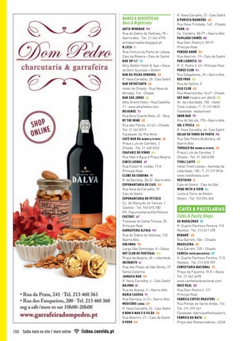 R. Nova Carvalho, 32 · Cais Sodré O PURISTA BARBIÉRE 4D Rua Nova Trindade, 16C · Chiado PARK 6I Cç. Combro, 58-7º - Bairro Alto PAVILHÃO CHINÊS 8E Rua Dom Pedro V, 89-91 Príncipe Real PENSÃO AMOR 3H Rua Alecrim, 19 - Cais do Sodré PUB LISBOETA 8E R. D. Pedro V, 63 - Príncipe Real PUREX CLUB 9J Rua Salgadeiras, 28 - Bairro Alto RED FROG 5G Rua do Salitre, 5 SILK CLUB 4D Rua Misericórdia, 14-6º · Chiado SKY BAR (reabre em Abril) 5E Av. da Liberdade, 185 · Hotel Tivoli Lisboa - T. 21 319 8832 Facebook: skybartivoli SNOB BAR 7F Rua do Século, 178 - Bairro Alto SOL E PESCA 2H R. Nova Carvalho, 44 · Cais Sodré SOLAR DO VINHO DO PORTO 9G Rua São Pedro Alcântara, 45 Bairro Alto TERRAÇO BA BAIRRO ALTO HOTEL 3E Praça Luís de Camões, 2 Chiado · Tel. 21 340 8288 TIVOLI CAFFÈ 5E Hotel Tivoli Lisboa - Avenida da Liberdade, 185 · T. 21 319 8934 www.tivolihotels.com VESTIGIUS 2i Cais do Sodré · Cais do Gás WINE WITH A VIEW 3J Junto à Torre de Belém Belém · Tel. 932 096 868