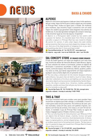 Alperce é uma marca portuguesa criada por duas irmãs apaixonadas por moda. Viajou do Porto para Lisboa e depois de uma estadia no Príncipe Real, mudou-se agora para o Chiado. De mulheres para mulheres, aqui encontra roupa e acessórios com um estilo hippie chic citadino que garantem looks elegantes mas atentos às tendências. E uma das (grandes) vantagens de comprar nesta loja, é não encontrar igual ao virar da esquina. A espreitar! 3 Alperce is a Portuguese label created by two sisters with a passion for fashion. It’s travelled down from Porto to Lisbon and after a sojourn in Príncipe Real has now moved to Chiado. By women for women, it sells urban hippie-chic-style clothes and accessories that ensure you look elegant but always in fashion. And one of the (big) benefits of shopping here is you won’t find anything else like it. Come and have a look! 3D Rua da Misericórdia, 49 · Tel. 933 791 977 · www.alperce.pt FB: Alperce · seg a sáb / mon to sat 10h30-20h · dom / sun 14h-20h