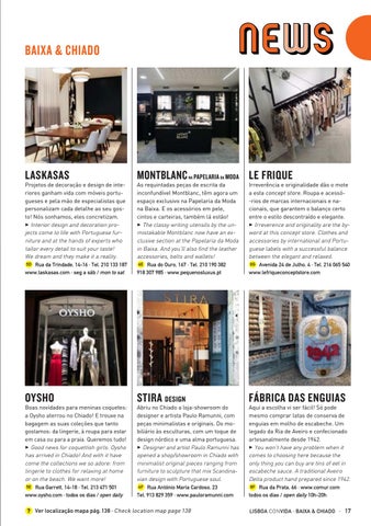 Irreverência e originalidade dão o mote a esta concept store. Roupa e acessó-rios de marcas internacionais e nacionais, que garantem o balanço certo entre o estilo descontraído e elegante. 3 Irreverence and originality are the byword at this concept store. Clothes and accessories by international and Portuguese labels with a successful balance between the elegant and relaxed. 0G Avenida 24 de Julho, 4 · Tel. 216 065 540 www.lefriqueconceptstore.com