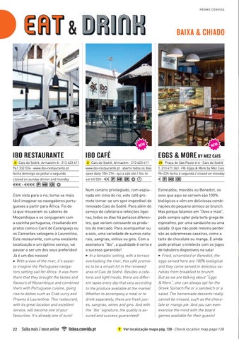 Num cenário privilegiado, com esplanada em cima do rio, este café promete tornar-se um spot imperdível do renovado Cais do Sodré. Para além do serviço de cafetaria e refeições ligeiras, todos os dias há petiscos diferentes, que variam consoante os produtos do mercado. Para acompanhar ou a solo, uma variedade de sumos naturais, sangrias, vinhos ou gins. Com a assinatura “Ibo”, a qualidade é certa e o sucesso garantido! 3 In a fantastic setting, with a terrace overlooking the river, this café promises to be a smash hit in the renewed area of Cais do Sodré. Besides a cafeteria and light meals, there are different tapas every day that vary according to the produce available at the market. Whether to accompany a meal or to drink separately, there are fresh juices, sangrias, wines and gins. And with the “Ibo” signature, the quality is assured and success guaranteed!