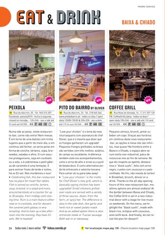 “Love your chicken” é o lema da nova churrasqueira com assinatura do chef Olivier, que é o mesmo que dizer que os frangos ganharam um upgrade! Pequenos frangos grelhados na brasa são servidos com três molhos: asiático, do campo ou escaldante. A diferença também está nos acompanhamentos, como o arroz de alho e ervas ou o puré de batata doce. E como alternativa ainda há entrecosto e salsicha toscana. Para comer ali ou para take away! 3 “Love your chicken” is the motto for Chef Olivier’s new grill, which is basically saying chicken has been upgraded! Small chickens grilled over coals are served with a variety of three sauces: Asian, from the farm, or spicy hot. The difference is also in the side dish, like garlic and herb rice or sweet potato mash. And as an added option there is also entrecote steak or Tuscan sausage. Both eat-in or takeaway.
