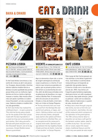 Pelo Largo de São Carlos passam várias estrelas e uma delas é gastronómica. José Avillez é a estrela deste restaurante que corresponde ao esplendor das grandes óperas. O interior é lindo com a sua decoração do séc. XVIII, mas temos um fraquinho pela fantástica esplanada, ideal para tomar um café a qualquer hora do dia. Aqui pode almoçar, jantar ou petiscar; conte com os clássicos Bifes, sabores tradicionais e o pastel de nata, receita do chef! 3 Many stars shoot through Largo de São Carlos, but one is from the culinary firmament: José Avillez, the star of this restaurant which compares to the splendour of the grand operas. The 18th-century interior décor is beautiful, but we have a soft spot for the fantastic outdoor tables, ideal for a coffee at any hour. You can lunch, dine or snack; expect the classic steaks, traditional flavours and the chef’s very own pastel de nata recipe! LISBOA CON VIDA · BAIXA & CHIADO · 27