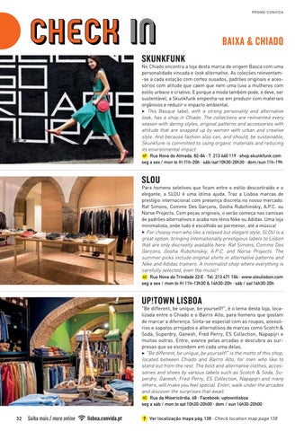 Para homens seletivos que ficam entre o estilo descontraído e o elegante, a SLOU é uma ótima ajuda. Traz a Lisboa marcas de prestígio internacional com presença discreta no nosso mercado: Raf Simons, Comme Des Garçons, Gosha Rubchinskiy, A.P.C. ou Norse Projects. Com peças originais, o verão começa nas camisas de padrões alternativos e acaba nos ténis Nike ou Adidas. Uma loja minimalista, onde tudo é escolhido ao pormenor, até a música! 3 For choosy men who like a relaxed but elegant style, SLOU is a great option, bringing internationally prestigious labels to Lisbon that are only discreetly available here: Raf Simons, Comme Des Garçons, Gosha Rubchinskiy, A.P.C. and Norse Projects. The summer picks include original shirts in alternative patterns and Nike and Adidas trainers. A minimalist shop where everything is carefully selected, even the music! 4C Rua Nova da Trindade 22 E · Tel. 213 471 104 · www.sloulisbon.com seg a sex / mon to fri 11h-13h30 & 14h30-20h · sáb / sat 14h30-20h