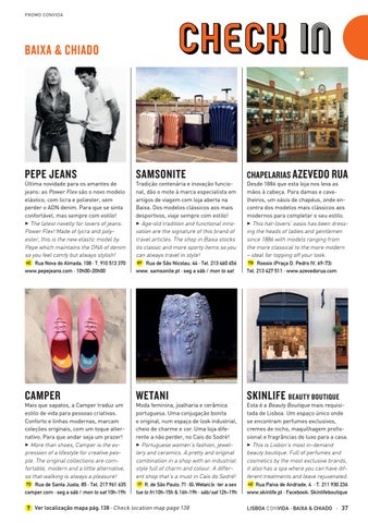 Mais que sapatos, a Camper traduz um estilo de vida para pessoas criativas. Conforto e linhas modernas, marcam coleções originais, com um toque alternativo. Para que andar seja um prazer! 3 More than shoes, Camper is the expression of a lifestyle for creative people. The original collections are comfortable, modern and a little alternative, so that walking is always a pleasure! 7D Rua de Santa Justa, 85 · Tel. 217 961 635 camper.com · seg a sáb / mon to sat 10h-19h