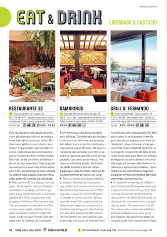 Este restaurante com quase 40 anos, é um clássico que não sai de moda e onde é sempre um prazer voltar. No charmoso jardim ou no interior acolhedor e requintado, são servidas receitas tradicionais da cozinha portuguesa muitíssimo bem confecionadas. Desfruta-se de um ótimo ambiente e de um serviço impecável. Seja ao jantar ou num almoço ao ar livre (menu almoço a E20), surpreenda os seus amigos ou celebre uma ocasião especial neste oásis perto da Avenida da Liberdade. 3 Restaurante 33 is a classic that has been riding high for almost 40 years and where it is always a treat to go back. Cosy inside and with a charming garden, the food is supremely well prepared traditional Portuguese fare. The atmosphere is excellent and the service impeccable, whether for an open-air lunch or dinner under the stars. Surprise your friends with this oasis next to Avenida da Liberdade.