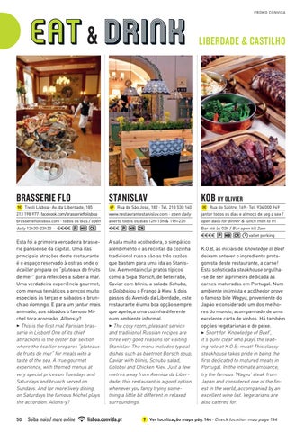 A sala muito acolhedora, o simpático atendimento e as receitas da cozinha tradicional russa são as três razões que bastam para uma ida ao Stanislav. A ementa inclui pratos típicos como a Sopa Borsch, de beterraba, Caviar com blinis, a salada Schuba, o Golobsi ou o Frango à Kiev. A dois passos da Avenida da Liberdade, este restaurante é uma boa opção sempre que apeteça uma cozinha diferente num ambiente informal. 3 The cosy room, pleasant service and traditional Russian recipes are three very good reasons for visiting Stanislav. The menu includes typical dishes such as beetroot Borsch soup, Caviar with blinis, Schuba salad, Golobsi and Chicken Kiev. Just a few metres away from Avenida da Liberdade, this restaurant is a good option whenever you fancy trying something a little bit different in relaxed surroundings.