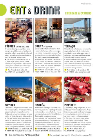 Um ambiente sofisticado e uma cozinha requintada, fazem deste restaurante um clássico a não falhar para quem é exigente e procura a qualidade da gastronomia tradicional portuguesa. 3 Sophisticated surroundings and refined cuisine, make this restaurant a classic that is not to be missed by any discerning customer who searches for excellence in traditional Portuguese food. 5E Tivoli Lisboa · Av. da Liberdade, 185 Tel. 21 319 8934 · todos os dias / open daily