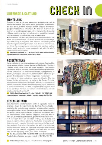 Fundada há mais de 100 anos, a Montblanc é sinónimo de tradição e mestria artesanal. Pelo design, estilo, qualidade e acabamentos das suas peças, a marca distingue-se com coleções intemporais que passam de geração em geração. Na Boutique da avenida encontram-se as icónicas canetas e outros instrumentos de escrita, relógios, carteiras, artigos em pele e outros acessórios masculinos, sempre com o requinte que caracteriza a marca. 3 Founded over 100 years ago, Montblanc is synonymous with tradition and craftsmanship. The brand stands out for the design, style and quality of its pieces, with timeless collections passed down from generation to generation. In its Boutique in the avenue, you’ll find the iconic pens and writing utensils, watches, wallets, leather goods and other male accessories all with the label’s characteristic sophistication. 5G Avenida da Liberdade, 111 · Tel. 21 325 9825 · www.montblanc.com segunda a sábado / monday to friday 10h00-19h00