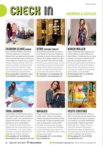 Marcas como Red Valentino, Pinko ou Yolan Cris são algumas das apostas desta loja, ideal para encontrar roupa para um cocktail ou uma festa. Atendimento personalizado e elegância garantida! 3 Red Valentino, Iceberg, Pinko and Yolan Cris are some of the labels stocked at this shop, an ideal place to find a special party frock. Personalised service and elegance guaranteed! 4C Rua Castilho, 59 · Tel. 210 997 930 www.vestecouture.com