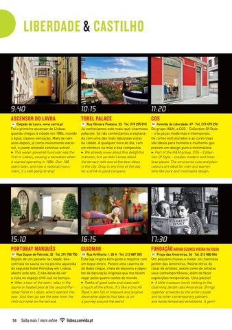 2C Praça das Amoreiras, 56 · Tel. 213 880 044 Um pequeno museu a visitar no charmoso jardim das Amoreiras. Reúne obras do casal de artistas, assim como de artistas seus contemporrâneos, além de fazer exposições temporárias. Uma pérola! 3 A little museum worth visiting in the charming Jardim das Amoreiras. Brings together artworks by the artist couple and by other contemporary painters and holds temporary exhibitions. A gem!