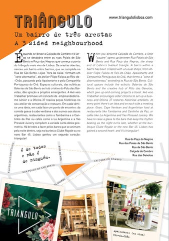hen you descend Calçada do Combro, a little “square” opens up between Rua Poiais de São Bento and Rua Poço dos Negros, the sharp end of Lisbon’s liveliest triangle. A bairro within a bairro has been created with unusual shops, from Atelier Filipe Faísca to Rés-do-Chão, Apaixonarte and Companhia Portugueza do Chá, that forms a “cone of alternativeness” extending to Rua de São Bento. Cultural spaces include the eclectic Galerias de São Bento and the creative hub of Pólo das Gaivotas, which give up-and-coming projects a boost. Avó veio Trabalhar encourages older citizens to set up a business and Oficina 37 restores historical artefacts. At every point there’s an idea and on each side a meeting place: Goan, Cape Verdean and Argentinian food at restaurants like Tambarina and Cantinho da Paz, or cafés like La Argentina and Yao Pressed Juicery. We have to raise a glass to the bars that keep the rhythm beating as the night turns late, whether at the burlesque Clube Royale or the new Bar 45. Lisbon has gained a second heart: and it’s triangular! Rua do Poço do Negros Rua dos Poiais de São Bento Rua de São Bento Calçada do Combro Rua das Gaivotas