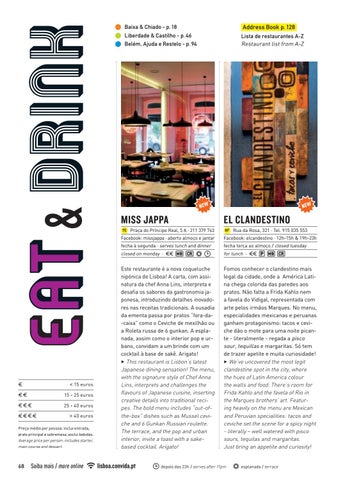 Este restaurante é a nova coqueluche nipónica de Lisboa! A carta, com assinatura da chef Anna Lins, interpreta e desafia os sabores da gastronomia japonesa, introduzindo detalhes inovadores nas receitas tradicionais. A ousadia da ementa passa por pratos “fora-da-caixa” como o Ceviche de mexilhão ou a Roleta russa de 6 gunkan. A esplanada, assim como o interior pop e urbano, convidam a um brinde com um cocktail à base de sakê. Arigato! 3 This restaurant is Lisbon’s latest Japanese dining sensation! The menu, with the signature style of Chef Anna Lins, interprets and challenges the flavours of Japanese cuisine, inserting creative details into traditional recipes. The bold menu includes “out-ofthe-box” dishes such as Mussel ceviche and 6 Gunkan Russian roulette. The terrace, and the pop and urban interior, invite a toast with a sakebased cocktail. Arigato!