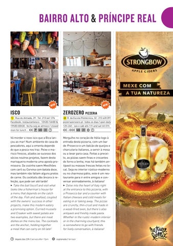 Vá morder o novo isco que a Bica lançou ao mar! Num ambiente de casa de pescadores, aqui a ementa depende do que a pesca nos traz. Peixe e marisco frescos, aliados ao sucesso dos sócios noutros projetos, fazem desta marisqueira moderna uma aposta promissora. Da cozinha saem Mexilhões com caril ou Corvina com batata doce, mas também não faltam alguns pratos de carne. Os cocktails dão âncora à refeição, que pode ser até tarde! 3 Take the bait (isco!) and visit what looks like a fisherman’s house for a menu that depends on the catch of the day. Fish and seafood, coupled with the owners’ success in other projects, make this modern eatery a promising option. Curried mussels and Croaker with sweet potato are two examples, but there are meat dishes on the menu too. The cocktails are the anchor, holding together a meal that can carry on till late!