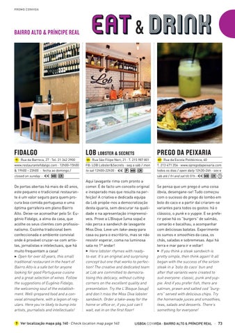 Aqui lavagante rima com pronto a comer. É de facto um conceito original e inesperado mas que resulta na perfeição! A criativa e dedicada equipa da Lob propõe-nos a democratização desta iguaria, sem descurar na qualidade e na apresentação irrepreensíveis. Prove a L’Bisque (uma sopa) e não perca a sandwich de lavagante Miss Diva. Leve um take-away para casa ou para o escritório, mas se não resistir esperar, coma na luminosa sala no 1º andar! 3 Here lobster rhymes with readyto-eat. It’s an original and surprising concept but one that works to perfection! The creative and dedicated team at Lob are committed to democratising this delicacy, without cutting corners on the excellent quality and presentation. Try the L’Bisque (soup) and don’t miss the Miss Diva lobster sandwich. Order a take-away for the home or office or, if you just can’t wait, eat in on the first floor!