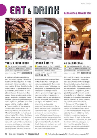 Numa das entradas do Bairro Alto, brilha um dos mais cosmopolitas restaurantes da capital. Com um secular poço de água e originais arcos pombalinos, o Lisboa à Noite prima pela cozinha contemporânea de sabores genuinamente portugueses, fruto dos melhores ingredientes e da cuidada atenção aos pormenores. Sempre muito bem acompanhados por alguns dos melhores e mais raros vinhos portugueses. 3 At one of the entrances to Bairro Alto is one of the most cosmopolitan restaurants in the capital. With an ancient well and original arches, Lisboa à Noite stands out for its contemporary cuisine yet genuinely Portuguese flavours, the fruit of the best ingredients and careful attention to detail. Food which is always very well accompanied by some of the best and rarest Portuguese wines.
