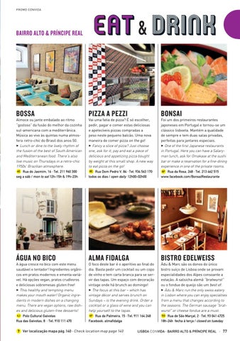 Almoce ou jante embalado ao ritmo “gostoso” da fusão do melhor da cozinha sul-americana com a mediterrânica. Música ao vivo às quintas numa atmosfera retro-chic do Brasil dos anos 50. 3 Lunch or dine to the lively rhythm of the fusion of the best of South American and Mediterranean food. There’s also live music on Thursdays in a retro-chic 1950s’ Brazilian atmosphere. 6E Rua do Jasmim, 16 · Tel. 211 960 300 seg a sáb / mon to sat 12h-15h & 19h-23h