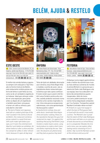 O melhor da comida italiana e japonesa sempre com vista para o Tejo! Situado no Centro Cultural de Belém, este restaurante combina pizzas em forno de lenha e sushi feitos ao vivo, como se de um verdadeiro espetáculo se tratasse. Ideal para almoçar antes de ver uma exposição, para jantar antes ou depois de um espetáculo e também para fazer uma pausa e tomar um café ou refresco, pois está aberto o dia todo! 3 The best of Italian and Japanese food with an unobstructed view of the river! Located in the Centro Cultural de Belém, this restaurant combines pizzas cooked in a wood-fired oven with sushi made right before your eyes, as if it were the entertainment. Ideal for lunch before an exhibition, for dinner before or after a show and also for a break for coffee or other refreshment, because it’s open all day long!