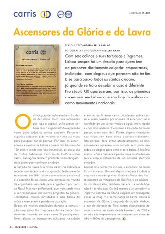 ditado popular aplica-se bem à cidade de Lisboa. Com ruas inclinadas por toda a capital, os lisboetas sabem bem o significado da expressão «para baixo todos os santos ajudam». Percorrer algumas calçadas pode mesmo ser uma aventura para qualquer par de pernas. Por isso, os ascensores e elevador de Lisboa apareceram há mais de 120 anos e ainda hoje são essenciais ao dia-a-dia de muitos habitantes. Com muita História sobre carris, são agora também ponto de visita obrigatória a quem quer conhecer a cidade. A Calçada do Lavra foi a primeira artéria lisboeta a receber um ascensor. A inauguração deste meio de transporte, em 1884, foi um acontecimento nacional e o aparelho foi na época uma inovação no mundo da engenharia, assinada pelo engenheiro portuense Raoul Mesnier de Ponsard, que mais tarde viria a ser responsável por outros projectos do género. Jornalistas, muitos convidados e uma banda de música marcaram a grande inauguração. Depois de muitos obstáculos durante a construção, o ascensor lá começou a subir e a descer diariamente, levando em cada carro 24 passageiros. Nesta altura, os transportes utilizados na cidade 8 · LIBERDADE con vida