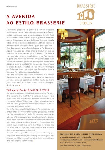 the avenida in brasserie style The brand new Brasserie Flo Lisboa is Lisbon’s first Parisianstyle brasserie. It is located on a grandiose corner of Hotel Tivoli Lisboa, in a room with slit windows, through which the trees and the blue of Lisbon enter. It has a separate entrance from the street, giving those walking by easy access to the atmosphere and flavours of Paris. One of the major attractions of Brasserie Flo Lisboa is the oyster bar, where the écailler prepares the “plateaux de fruits de mer” for seafood inspired meals. But the menu has a myriad selection of delicious options for something French in the heart of Lisbon. And there’s not a minute to waste, as the waiters twist and turn to serve their customers, à la the city of light itself. It’s just as well they learnt their trade in Paris so they can serve with the style and professionalism that Brasserie Flo’s customers have come to expect. One of the advantages of this new restaurant is the long opening hours, which means you can enjoy one of the great breakfasts from 7.00am onwards and a late dinner until midnight, ideal after catching a show nearby.•