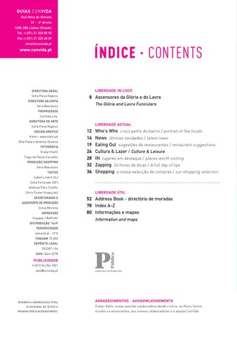 Who’s Who cinco perfis do bairro / portrait of five locals News últimas novidades / latest news Eating Out sugestões de restaurantes / restaurant suggestions Cultura & Lazer / Culture & Leisure IN lugares em destaque / places worth visiting Zapping 24 horas de dicas / A full day of tips Shopping a nossa selecção de compras / our shopping selection