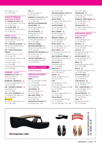 Av. da Liberdade, 160 5 G Tel. 21 323 0200 • Av. da Liberdade, 225 4 E Tel. 21 359 6100 Rua Rosa Araújo, 49 A Tel. 21 351 3830 Bem Vindo Tours 3 F