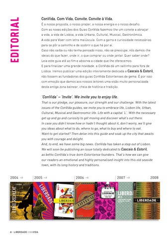 ConVida, Com Vida, Convite. Convite à Vida. É a nossa proposta, o nosso prazer, a nossa energia e o nosso desafio. Com as novas edições dos Guias ConVida fazemos-lhe um convite a abraçar a vida, a vida de Lisboa, a vida Urbana, Cultural, Musical, Gastronómica. A vida para Viver com letra maiúscula. Com a garra e curiosidade necessárias para se pôr a caminho e de scobrir o que há por aí. Caso não saiba ou não tenha pensado nisso, não se preocupe, nós damos-lhe ideias do que fazer, onde ir, o que comprar ou onde jantar. Quer saber onde? Leia este guia até ao fim e absorva a cidade que lhe oferecemos. E para finalizar uma grande novidade: a ConVida dá um saltinho para fora de Lisboa. Iremos publicar uma edição inteiramente dedicada a Cascais & Estoril, não fossem as fundadoras dos guias ConVida Estorilenses de gema. É por isso com emoção que damos aos nossos leitores uma visão muito personalizada desta antiga zona balnear, cheia de história e tradição.