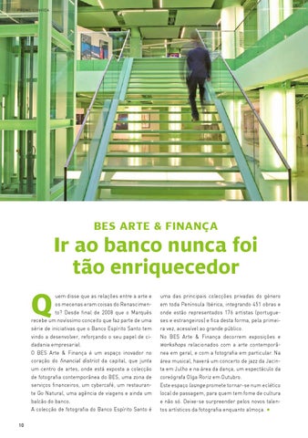 uem disse que as relações entre a arte e os mecenas eram coisas do Renascimento? Desde final de 2008 que o Marquês recebe um novíssimo conceito que faz parte de uma série de iniciativas que o Banco Espírito Santo tem vindo a desenvolver, reforçando o seu papel de cidadania empresarial. O BES Arte & Finança é um espaço inovador no coração do financial district da capital, que junta um centro de artes, onde está exposta a colecção de fotografia contemporânea do BES, uma zona de serviços financeiros, um cybercafé, um restaurante Go Natural, uma agência de viagens e ainda um balcão do banco. A colecção de fotografia do Banco Espírito Santo é