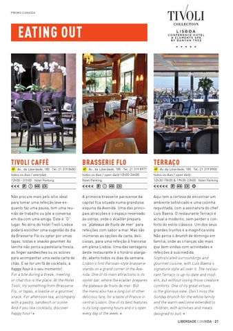 Aqui tem a certeza de encontrar um ambiente sofisticado e uma cozinha requintada, com a assinatura do chef Luís Baena. O restaurante Terraço é actual e moderno, sem perder o conforto do estilo clássico. Um dos seus grandes trunfos é a magnífica vista. Não perca o brunch de domingo em família, onde as crianças são mais que bem vindas com actividades e refeições à sua medida. Sophisticated surroundings and gourmet cuisine, with Luís Baena’s signature style all over it. The restaurant Terraço is up-to-date and modern, but without losing those creature comforts. One of its great virtues is the glorious view. Don’t miss the Sunday brunch for the whole family and the warm welcome extended to children, with activities and meals designed to suit. • LIBERDADE con vida · 21