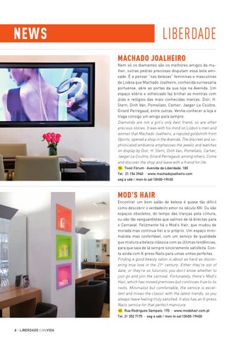 liberdade Machado Joalheiro Nem só os diamantes são os melhores amigos da mulher, outras pedras preciosas disputam essa bela amizade. É a pensar “nas belezas” femininas e masculinas de Lisboa que Machado Joalheiro, conhecida ourivesaria portuense, abre as portas da sua loja na Avenida. Um espaço sóbrio e sofisticado faz brilhar as montras com jóias e relógios das mais conhecidas marcas: Dior, H. Stern, Dinh Van, Pomellato, Cartier, Jaeger Le Coultre, Girard Perregaud, entre outras. Venha conhecer a loja e traga consigo um amigo para sempre. Diamonds are not a girl’s only best friend; so are other precious stones. It was with his mind on Lisbon’s men and women that Machado Joalheiro, a reputed goldsmith from Oporto, opened a shop in the Avenida. The discreet and sophisticated ambiance emphasises the jewels and watches on display by Dior, H. Stern, Dinh Van, Pomellato, Cartier, Jaeger Le Coultre, Girard Perregaud, among others. Come and discover the shop and leave with a friend for life. 5G