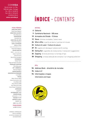 6 Editorial 9 Confeitaria Nacional - 180 anos 10 Armazéns do Chiado - 10 Anos 12 News últimas novidades / latest news 24 Who’s Who 4 perfis do bairro / portrait of 4 locals 26 Cultura & Lazer / Culture & Leisure 29 IN lugares em destaque / places worth visiting 32 Eating Out sugestões de restaurantes / restaurant suggestions 36 Zapping 24 horas de dicas / a full day of tips 38 Shopping a nossa selecção de compras / our shopping selection