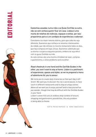 Roast chestnuts in one hand and the ConVida Guides in the other, you won’t want to stay at home. Lisbon is a patchwork of experiences, spaces and styles, so we’ve prepared a menu of adventures for you to savour. We invite you to create daily itineraries so that each day is different. We want you to discover the city’s secret places, to have lunch in different restaurants and to shop at unique stores. Above all we want you to enjoy yourself and to lose yourself as you wander, though that may be difficult with the ConVida Guides in your hand. Lisbon’s seven hills are an endless shop-window of leisure, shopping and gastronomic possibilities, the only problem is being able to choose. S o f i a P a i va R ap o s o