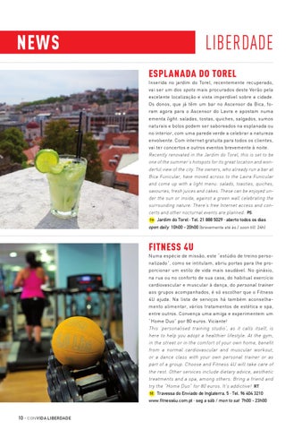 liberdade Esplanada do Torel Inserida no jardim do Torel, recentemente recuperado, vai ser um dos spots mais procurados deste Verão pela excelente localização e vista imperdível sobre a cidade. Os donos, que já têm um bar no Ascensor da Bica, foram agora para o Ascensor do Lavra e apostam numa ementa light: saladas, tostas, quiches, salgados, sumos naturais e bolos podem ser saboreados na esplanada ou no interior, com uma parede verde a celebrar a natureza envolvente. Com internet gratuita para todos os clientes, vai ter concertos e outros eventos brevemente à noite. Recently renovated in the Jardim do Torel, this is set to be one of the summer’s hotspots for its great location and wonderful view of the city. The owners, who already run a bar at Bica Funicular, have moved across to the Lavra Funicular and come up with a light menu: salads, toasties, quiches, savouries, fresh juices and cakes. These can be enjoyed under the sun or inside, against a green wall celebrating the surrounding nature. There’s free Internet access and concerts and other nocturnal events are planned. PS 7H