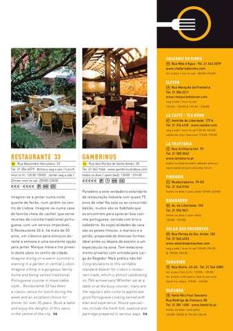 Imagine-se a jantar numa noite quente de Verão, num jardim no centro de Lisboa. Imagine-se numa casa de família cheia de cachet, que serve receitas de cozinha tradicional portuguesa, com um serviço impecável… O Restaurante 33 é, há mais de 30 anos, um clássico para almoços durante a semana e uma excelente opção para jantar. Marque mesa e tire proveito deste oásis no centro da cidade. Imagine dining on a warm summer’s evening in a garden in central Lisbon. Imagine sitting in a gorgeous family home and being served traditional Portuguese cuisine in impeccable style… Restaurante 33 has been a classic venue for lunch during the week and an excellent choice for dinner for over 30 years. Book a table and enjoy the delights of this oasis in the centre of the city. VA
