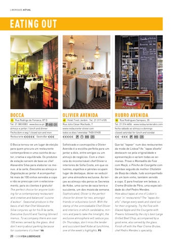 O Bocca tornou-se um lugar de eleição para quem procura um restaurante contemporâneo e uma cozinha de autor, criativa e equilibrada. Os produtos de estação servem de base ao chef Alexandre Silva para elaborar os menus: à la carte, Executivo ao almoço e Degustação ao jantar. A acompanhar há mais de 100 vinhos servidos a copo e não se preocupe com o estacionamento, para os clientes é gratuito! The perfect choice for anyone looking for a contemporary restaurant and creative and balanced ‘cuisine d’auteur’. Seasonal produce is the basis of all that Chef Alexandre Silva conjures up for his À la carte, Executive (lunch) and Tasting (dinner) menus. To accompany there are over 100 wines served by the glass. And don’t worry about parking because for customers it’s free! VA 20 · con vida LIBERDADE