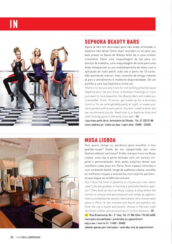 IN sephora beauty bars Agora já não tem desculpas para não andar arranjada, a Sephora não deixa! Entre duas reuniões ou só para seu belo prazer os Bares de Beleza farão de si uma mulher irresistível. Fazer uma maquilhagem de dia para um almoço de trabalho, uma maquilhagem de noite para uma festa inesquecível ou um embelezamento de mãos com a aplicação de nails patch, tudo isto a partir de 10 euros. Não precisa de marcar, mas, conselho de amiga, reserve já pois o atendimento é mediante disponibilidade. Dê um pulinho a uma loja Sephora e mime-se! There’s no excuse any more for not looking great because Sephora won’t let you! If you’re between meetings or if you just want to look beautiful, the Beauty Bars will make you irresistible. From 10 euros, get made-up for a business lunch or for an unforgettable party at night, or make your nails perfect with a nails patch. You don’t need to book, but we recommend you do. Head over to a Sephora shop and start looking good in the wink of an eye! CV Loja mais perto de si: Armazéns do Chiado · Tel. 21 322 51 88 www.sephora.pt · todos os dias / open daily 10h00 - 22h00