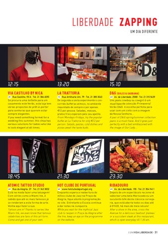 4G Av. da Liberdade, 155 · Tel. 21 354 9411 Depois de um espectáculo na zona vá saborear uma bela Mariscada ou um suculento bife desta clássica cervejaria, que está aberta todos os dias até à 01h30, há mais de meio século! After a show in the area, cross the Avenue for a delicious Seafood ‘plateau’ or a succulent steak at this restaurant, which is open everyday till 1.30 am.